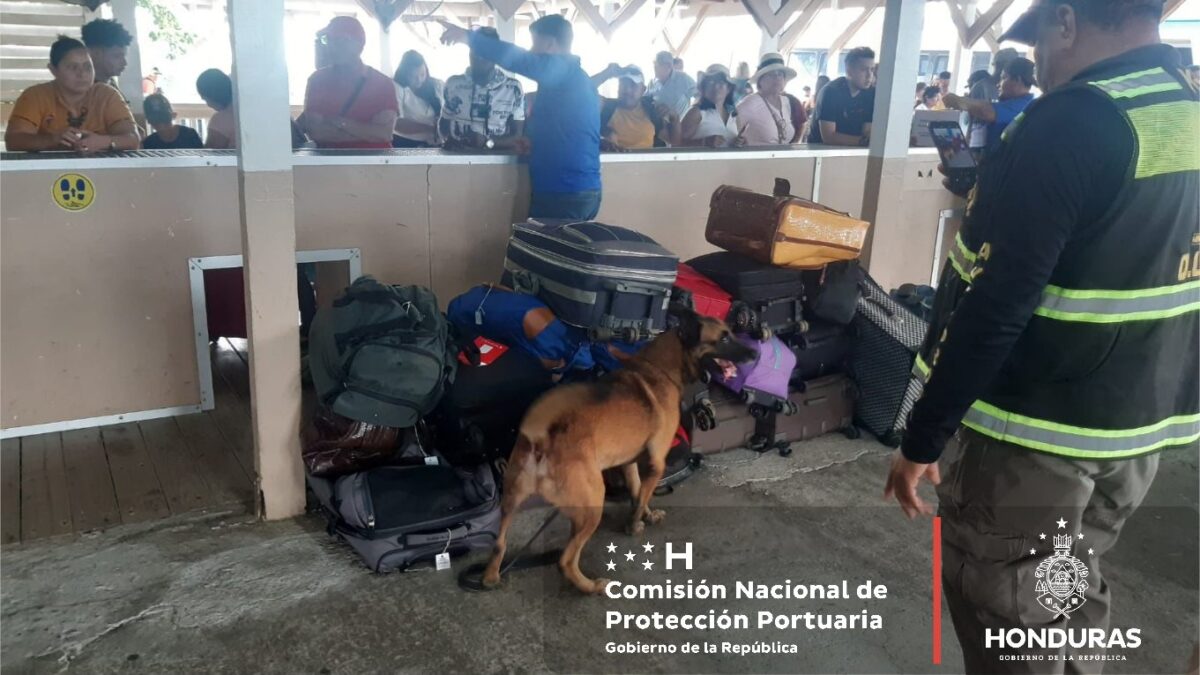 El Destacamento K-9 de la PMOP y bajo control operacional de la Comisión Nacional de Protección Portuaria realiza operativo canino en el portón de acceso del personal administrativo de la ENP de Puerto Cortes, con el fin de prevenir y evitar amenazas o introducción de ilícitos a la instalación portuaria.