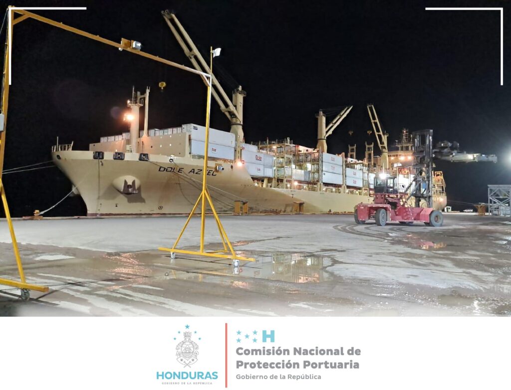 La sección de inspectoría de protección de la Comisión Nacional de Protección Portuaria asignada a Puerto Castilla, Colón verifica los procedimientos de manipulación de carga general a buques de Dole.