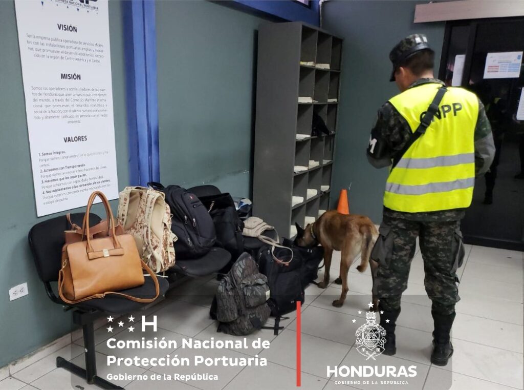 El Destacamento K-9 de la PMOP y bajo control operacional de la Comisión Nacional de Protección Portuaria realiza operativo canino en el portón de acceso del personal administrativo de la ENP de Puerto Cortes, con el fin de prevenir y evitar amenazas o introducción de ilícitos a la instalación portuaria.