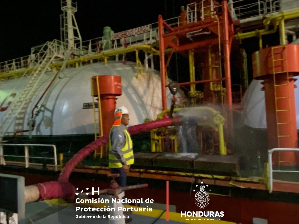 Oficial Inspector de Protección Portuaria de Roatán, supervisa los procedimientos de manipulación de la carga en una instalación portuaria del departamento insular.